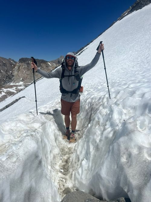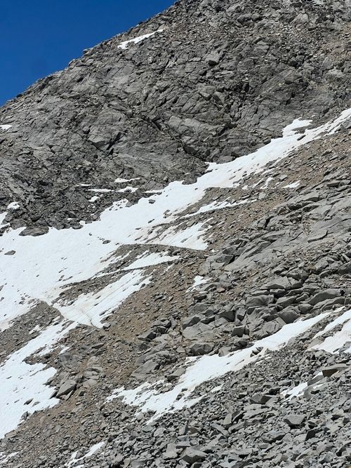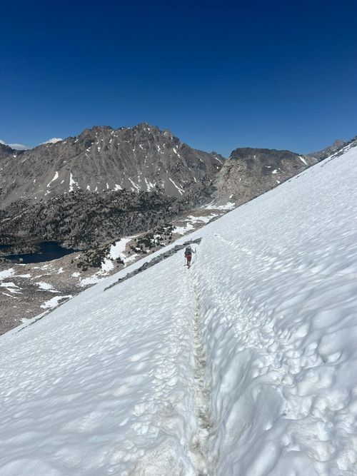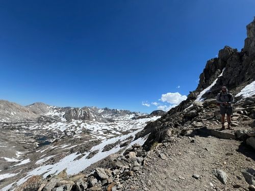 On Mather pass, (see photo of diagonal line in the snowy switch backs), the snow seemed too soft for good traction. We therefore scrambled from switch to switch, passing into class 2 and in one occasion class 3!  This was a new experience with a pack! Thankfully we did not experience any falls as we scrambled up the scree to the 12,093’ pass!